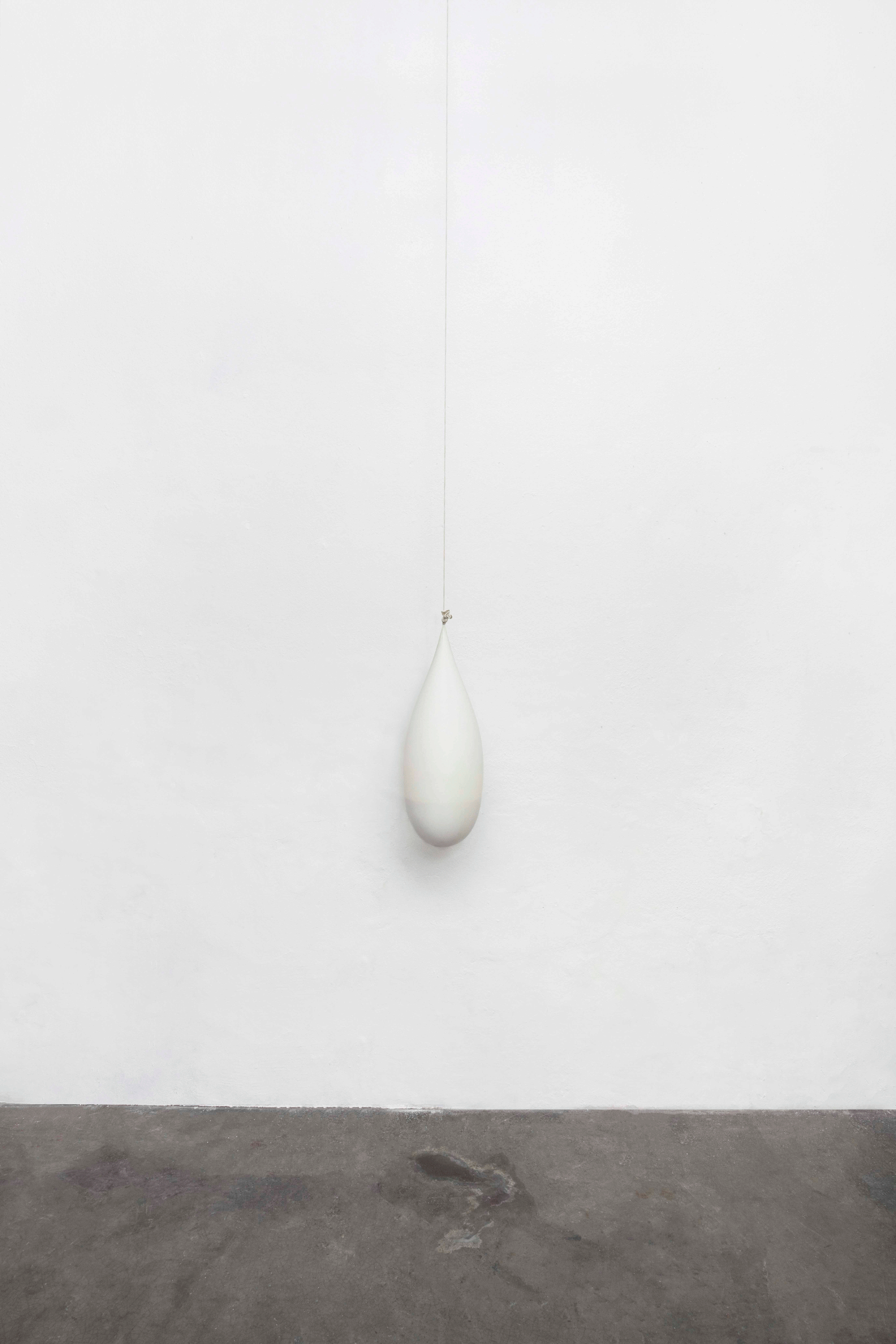 Uma bexiga de leite ou mãe [A milk bladder or mother] a work of air, milk and a balloon. These three common elements found in everyday life acquire a new meaning when placed into a confined space with one another.